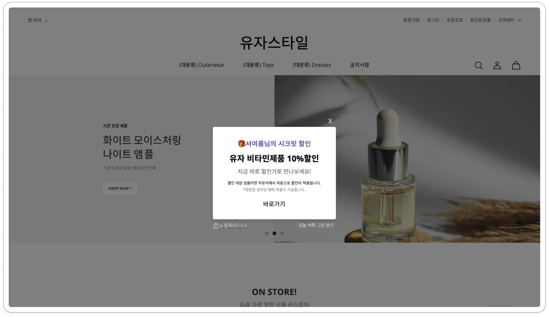 또는 한 가지 상품만 할인할 경우, 해당 상품의 상품페이지 링크를 넣어서 사용해 보세요! 고객들이 ‘바로가기’를 클릭할 경우, 입력된 카테고리 또는 상품페이지로 이동하여 할인되는 상품을 보고 구매할 수 있어요!!